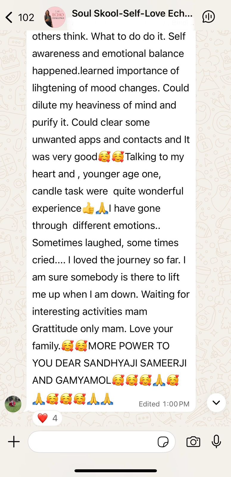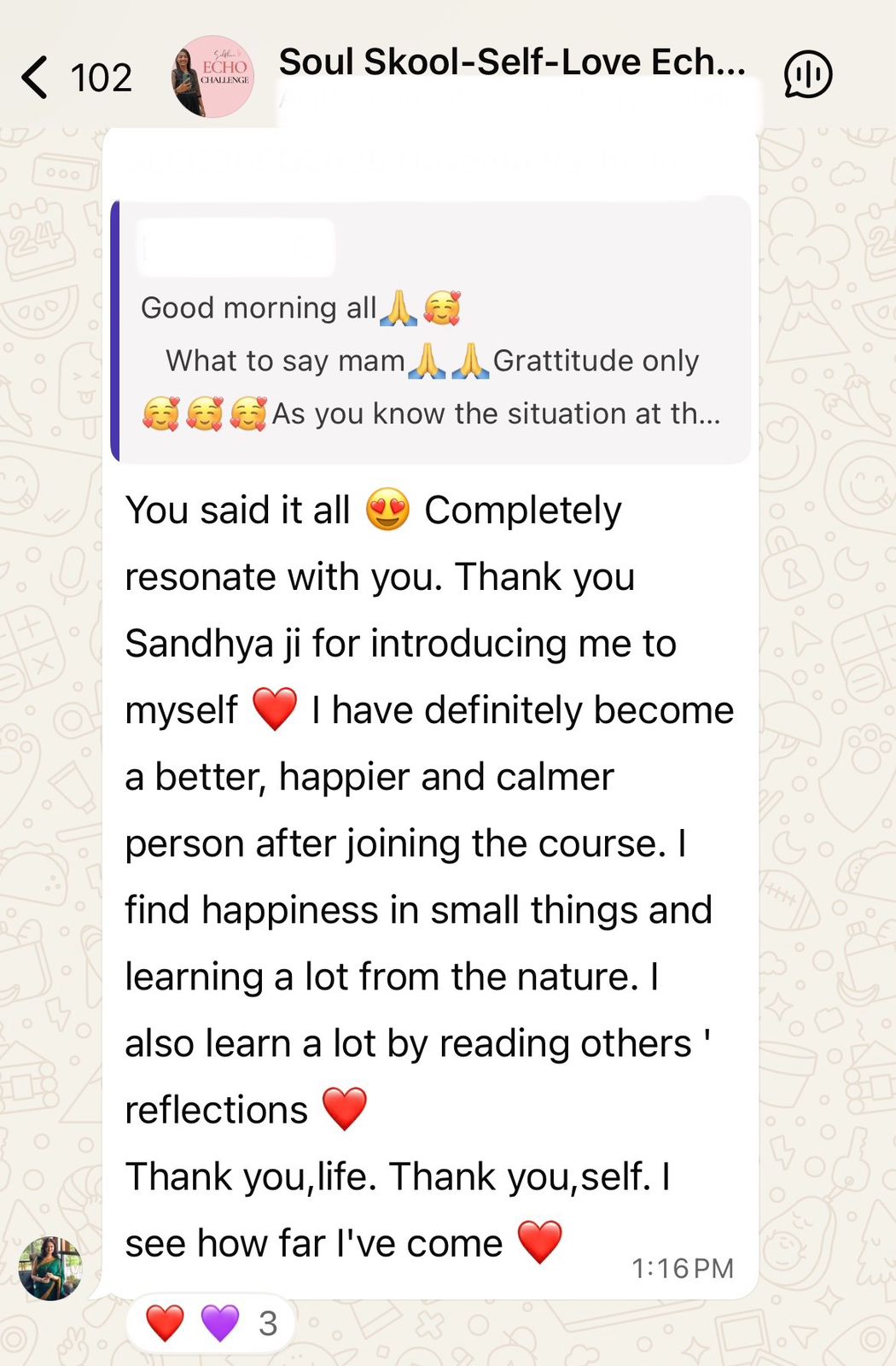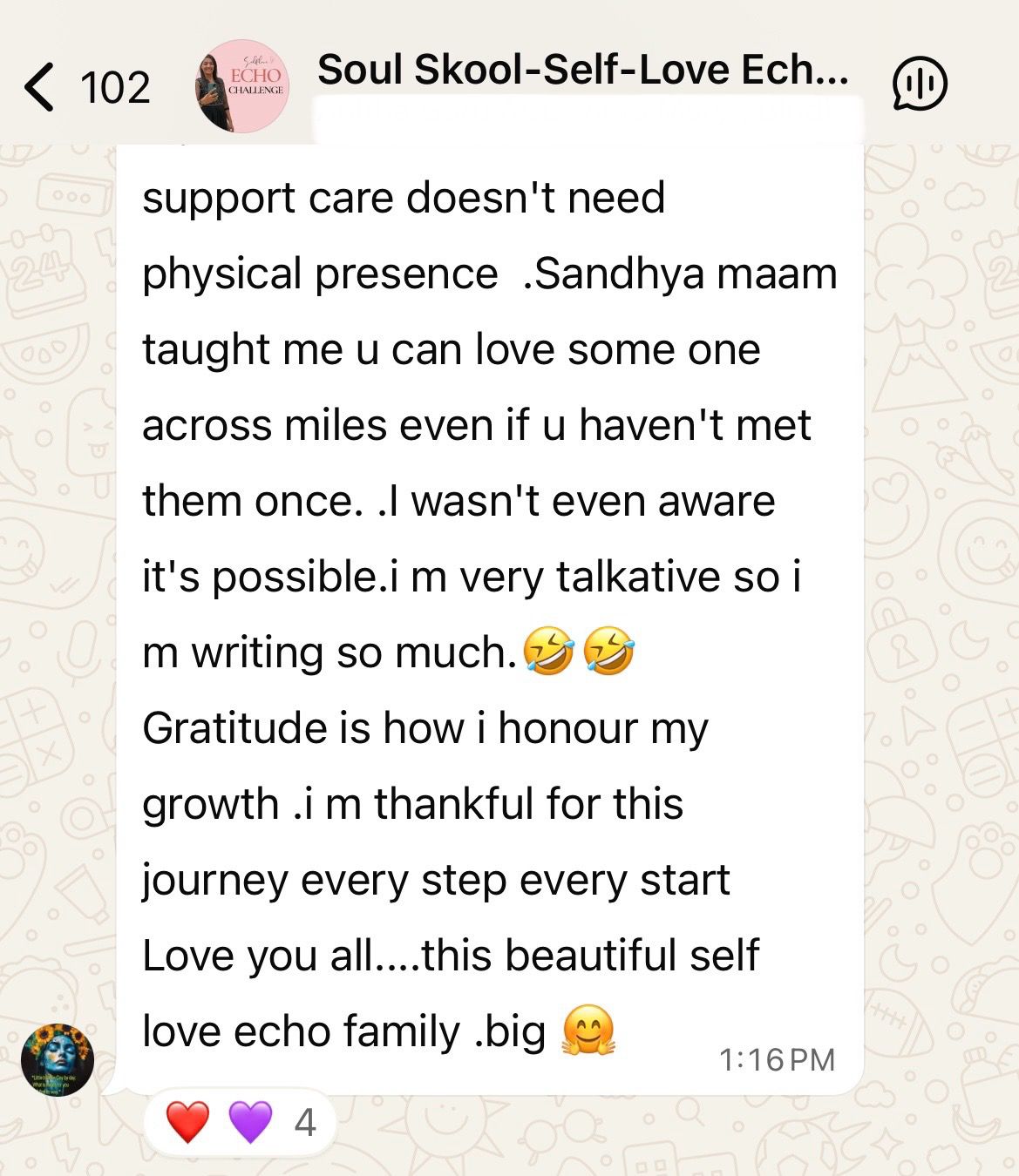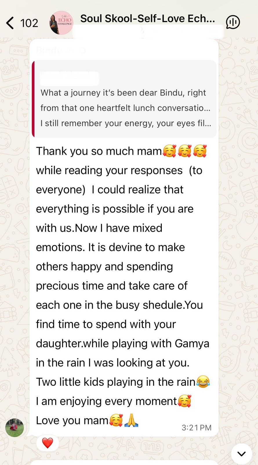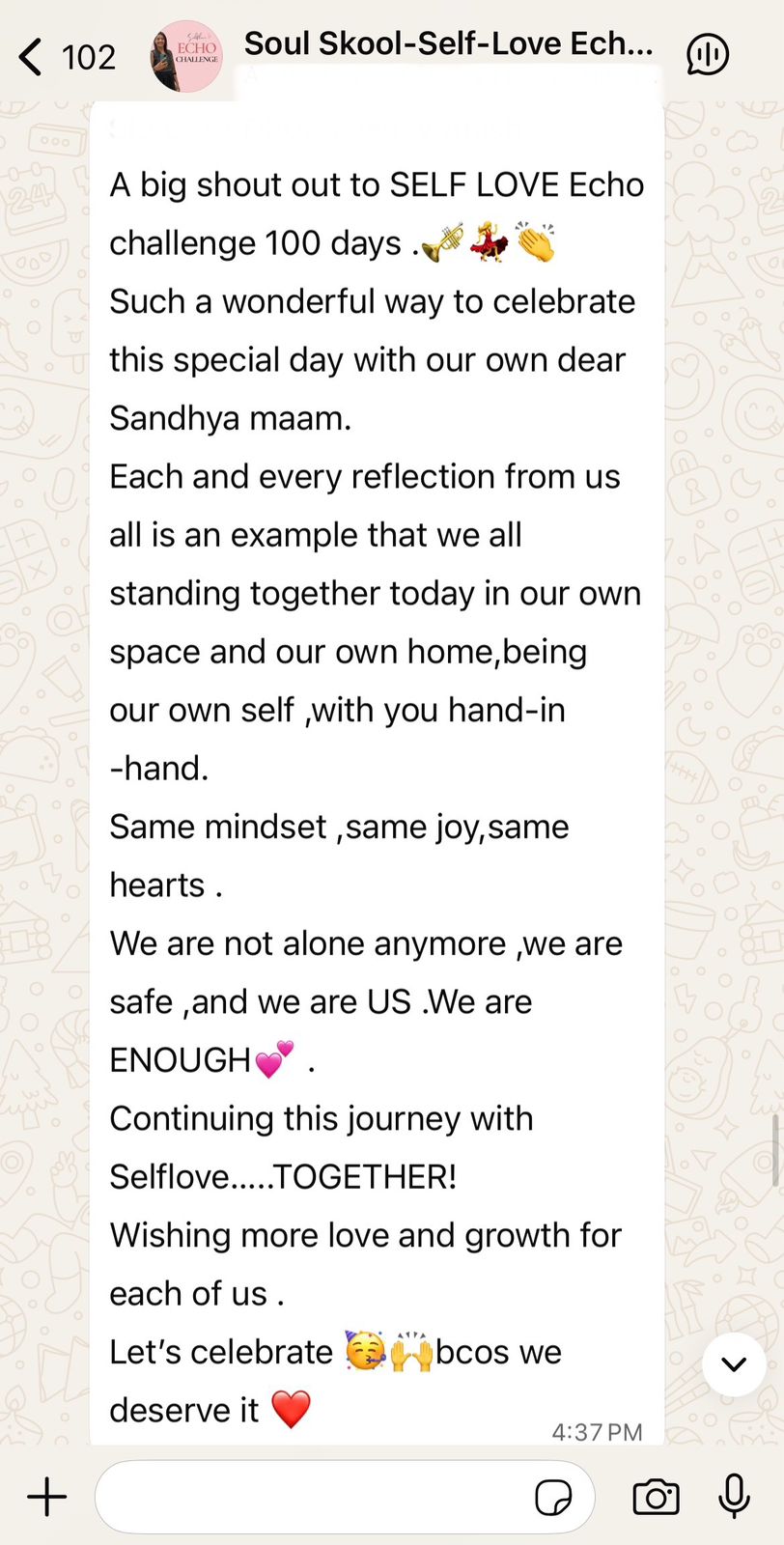 The Self-Love Echo Challenge taught me what self-love is, how to create boundaries, when to say 'no,' and how to let go of negative thoughts. - Bindhu
