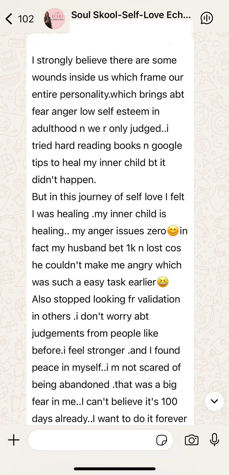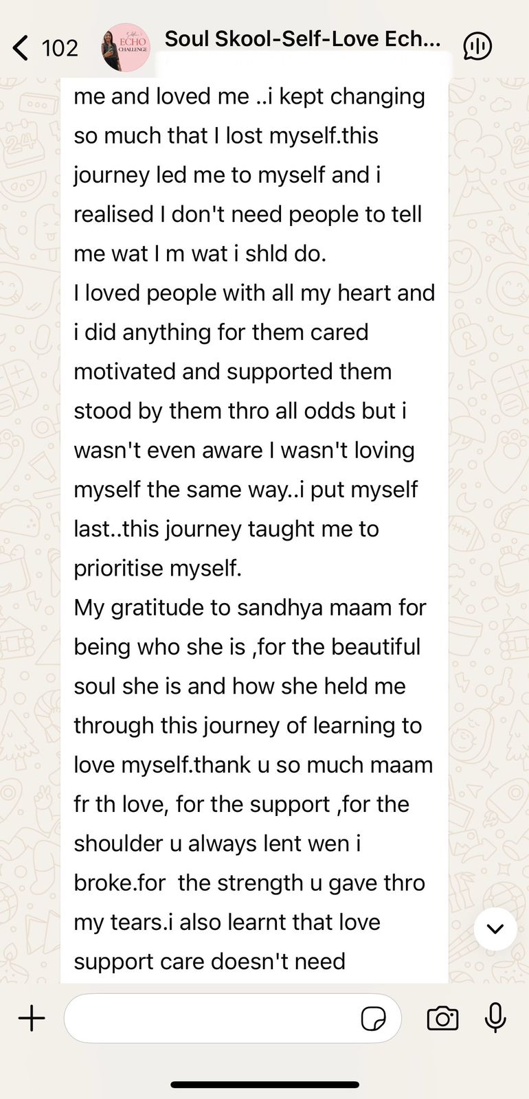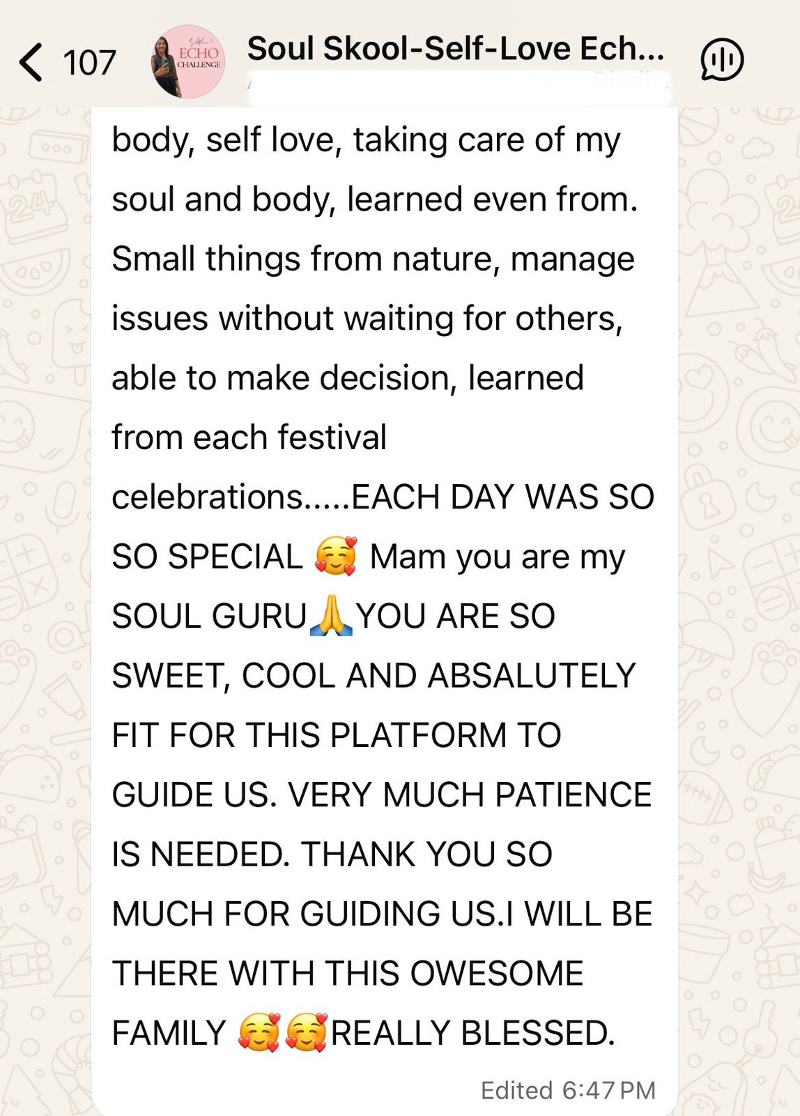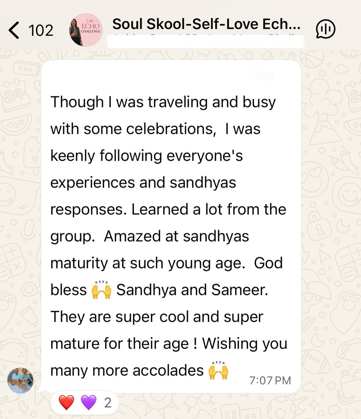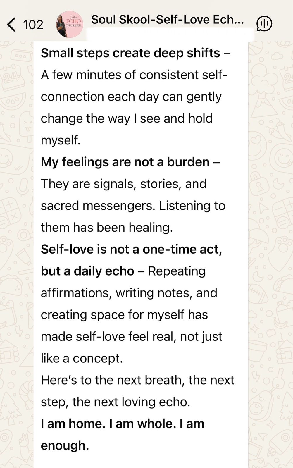 The Self-Love Echo Challenge taught me what self-love is, how to create boundaries, when to say 'no,' and how to let go of negative thoughts. - Bindhu