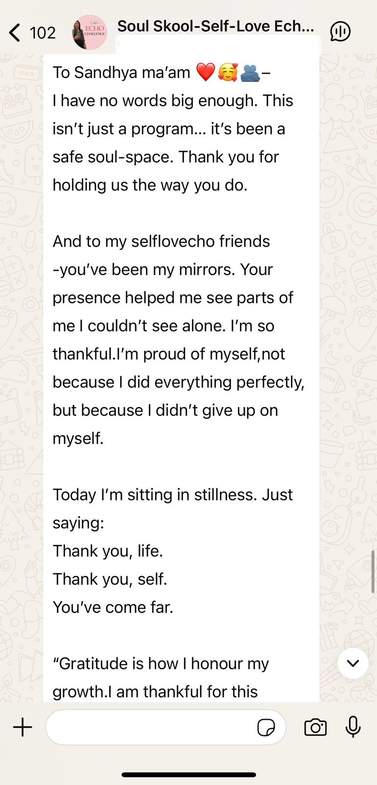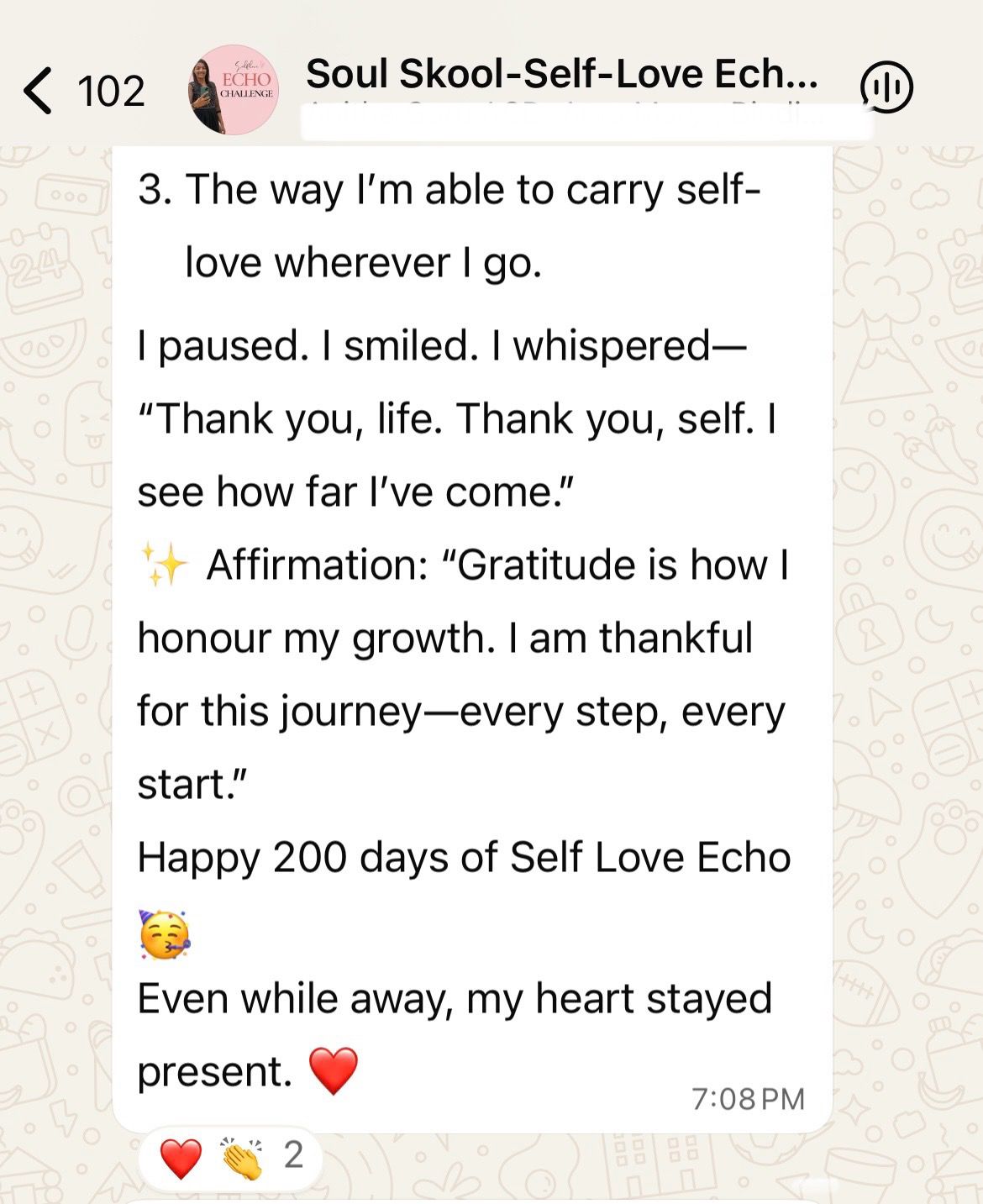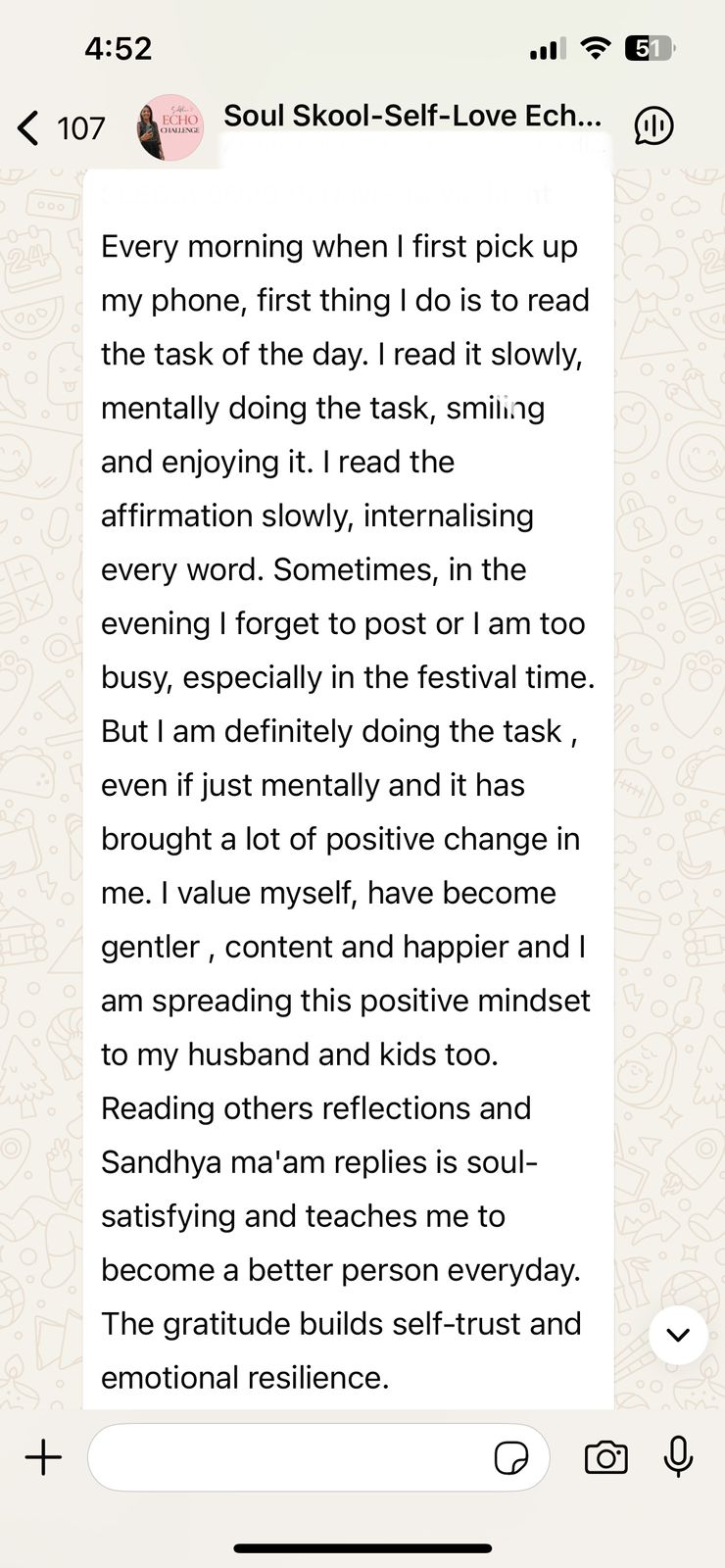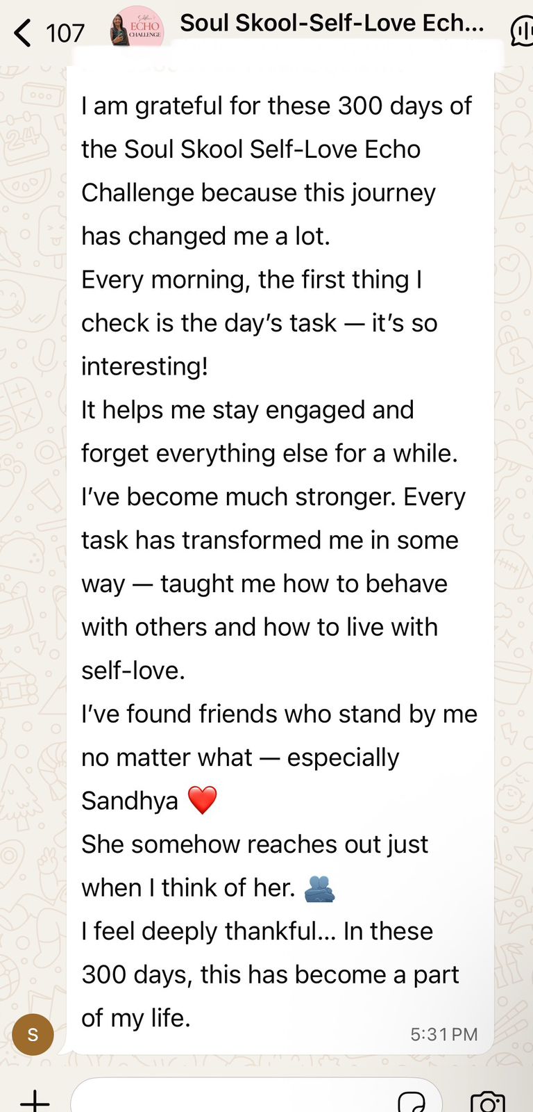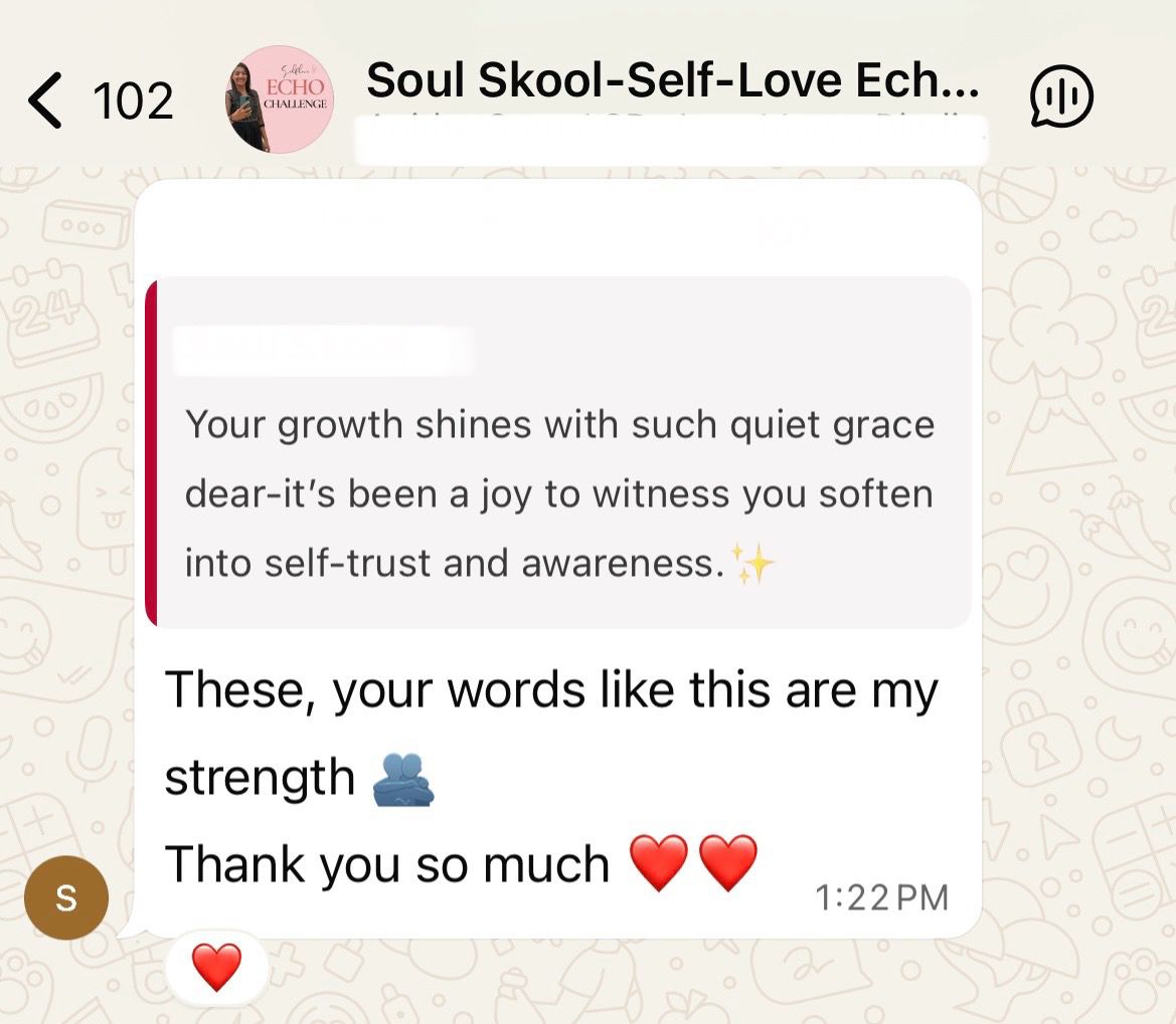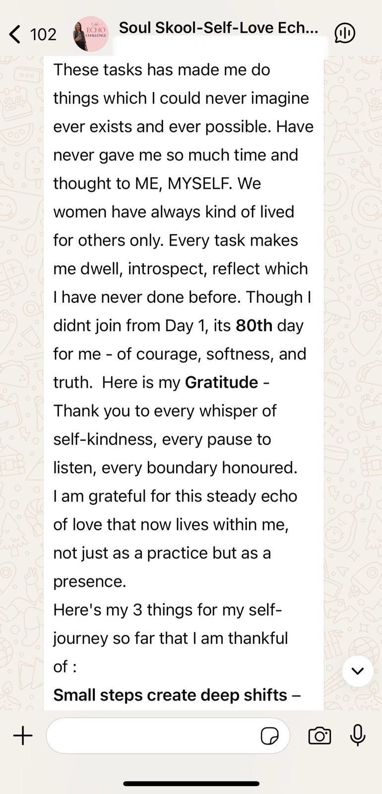The Self-Love Echo Challenge taught me what self-love is, how to create boundaries, when to say 'no,' and how to let go of negative thoughts. - Bindhu