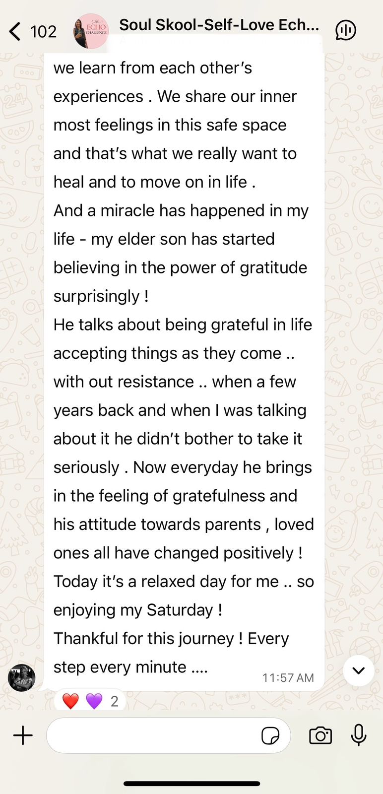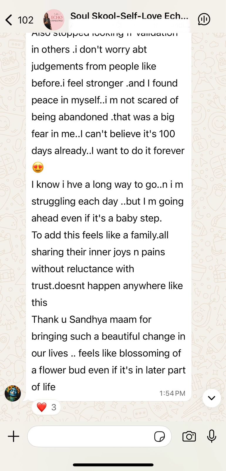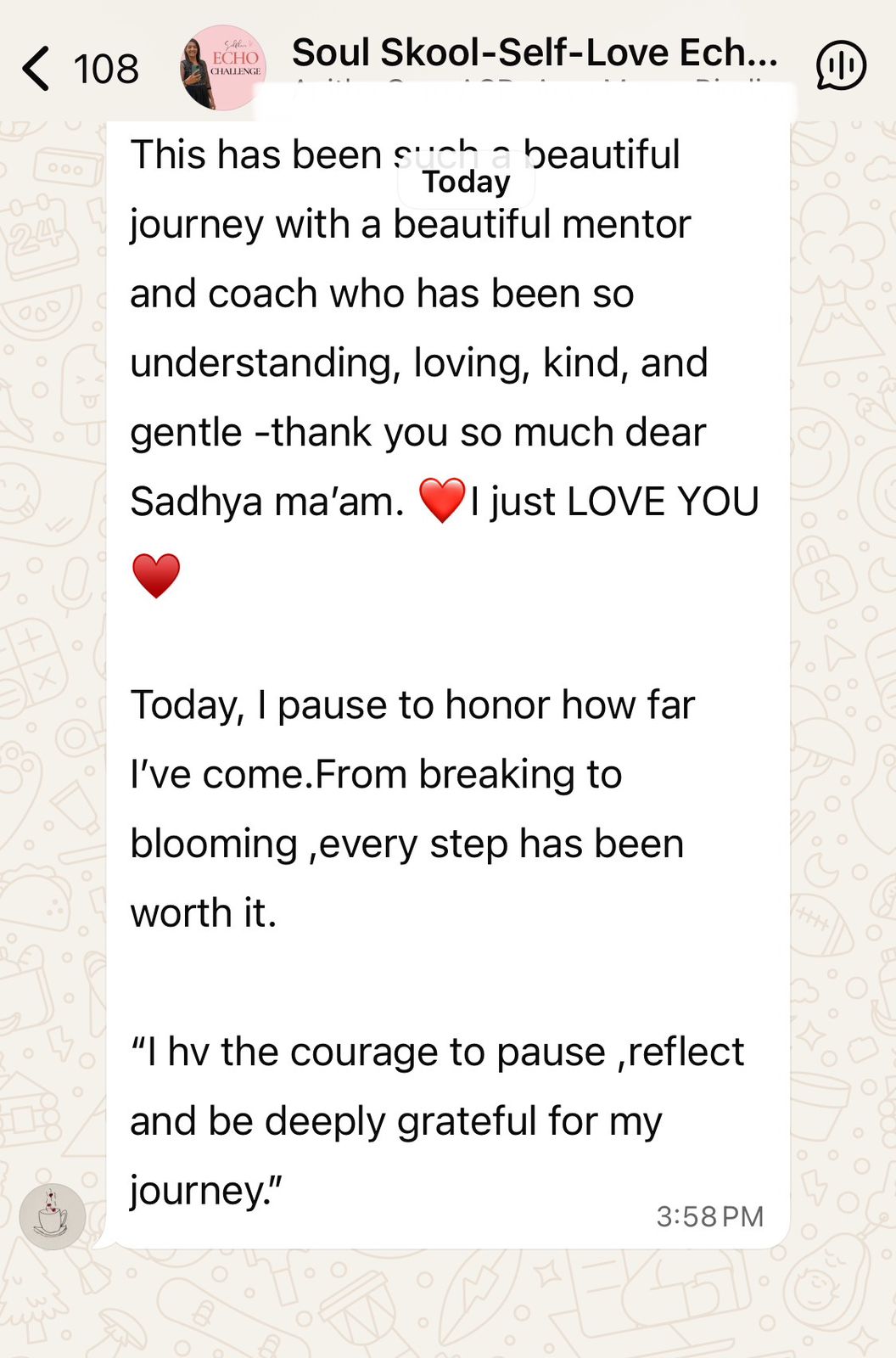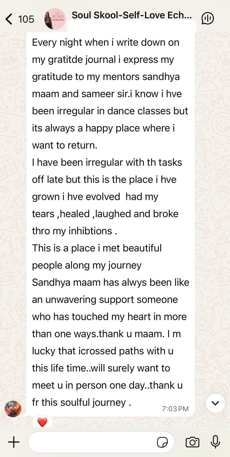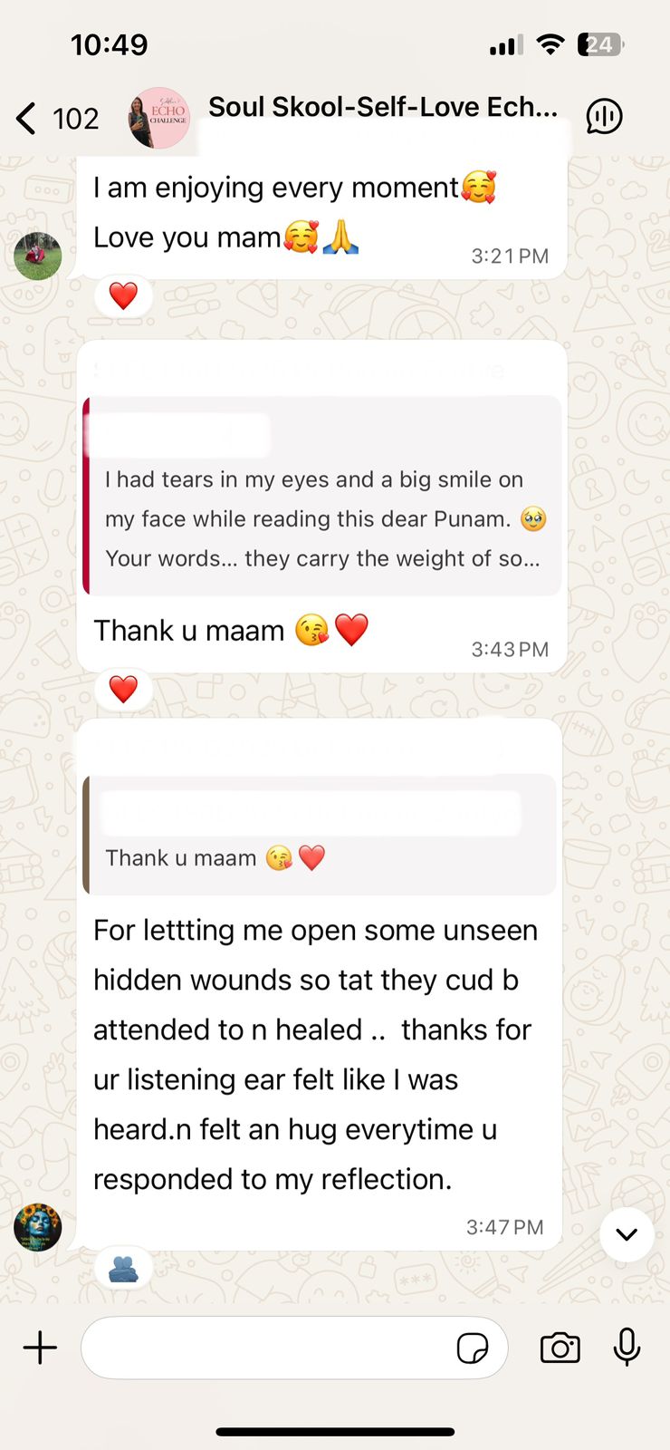 The Self-Love Echo Challenge taught me what self-love is, how to create boundaries, when to say 'no,' and how to let go of negative thoughts. - Bindhu