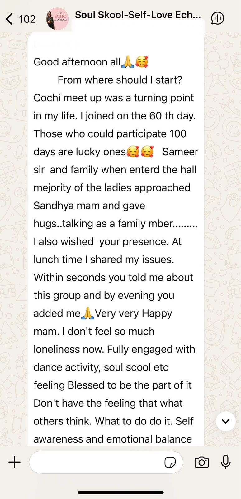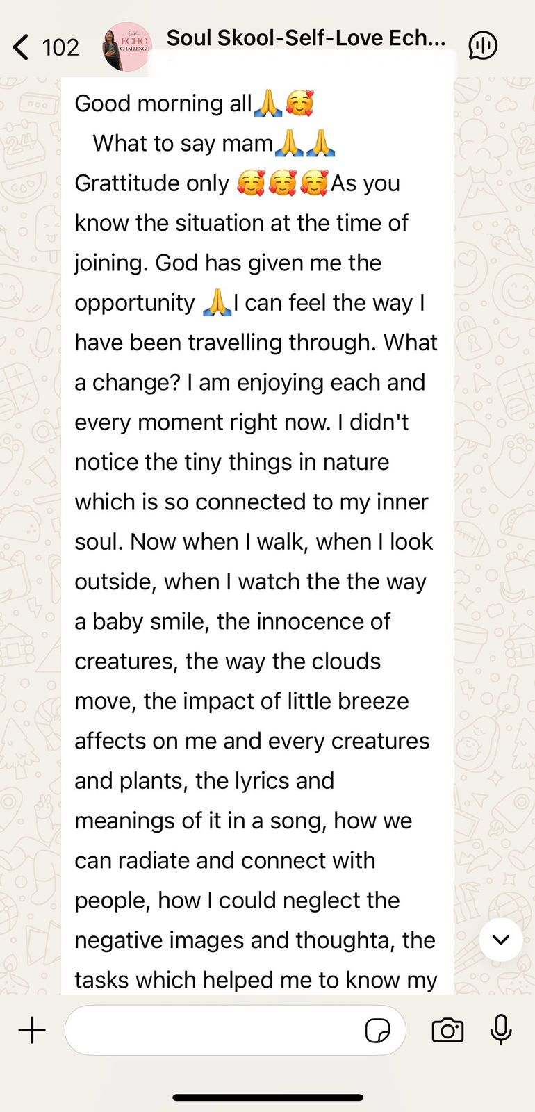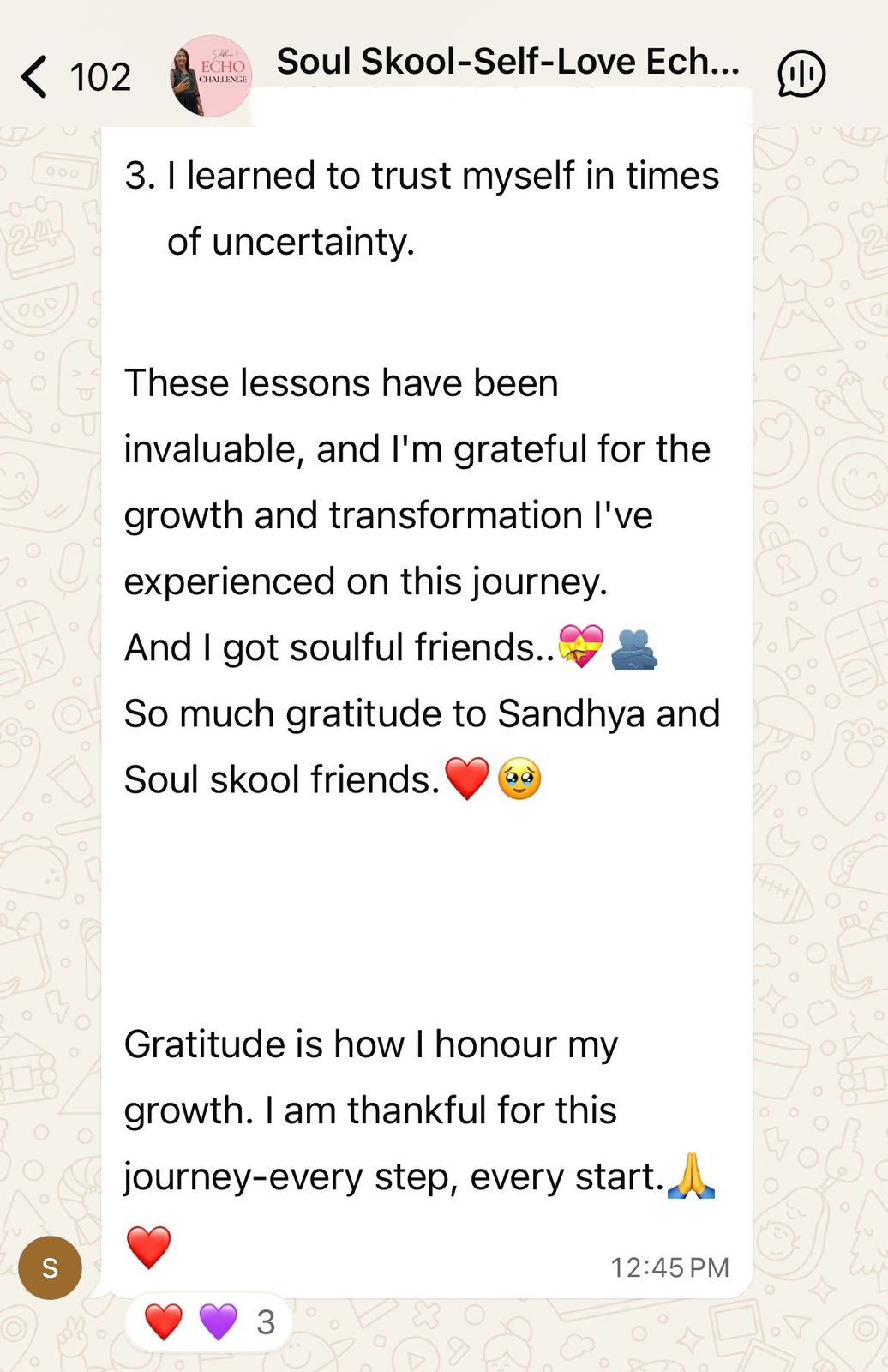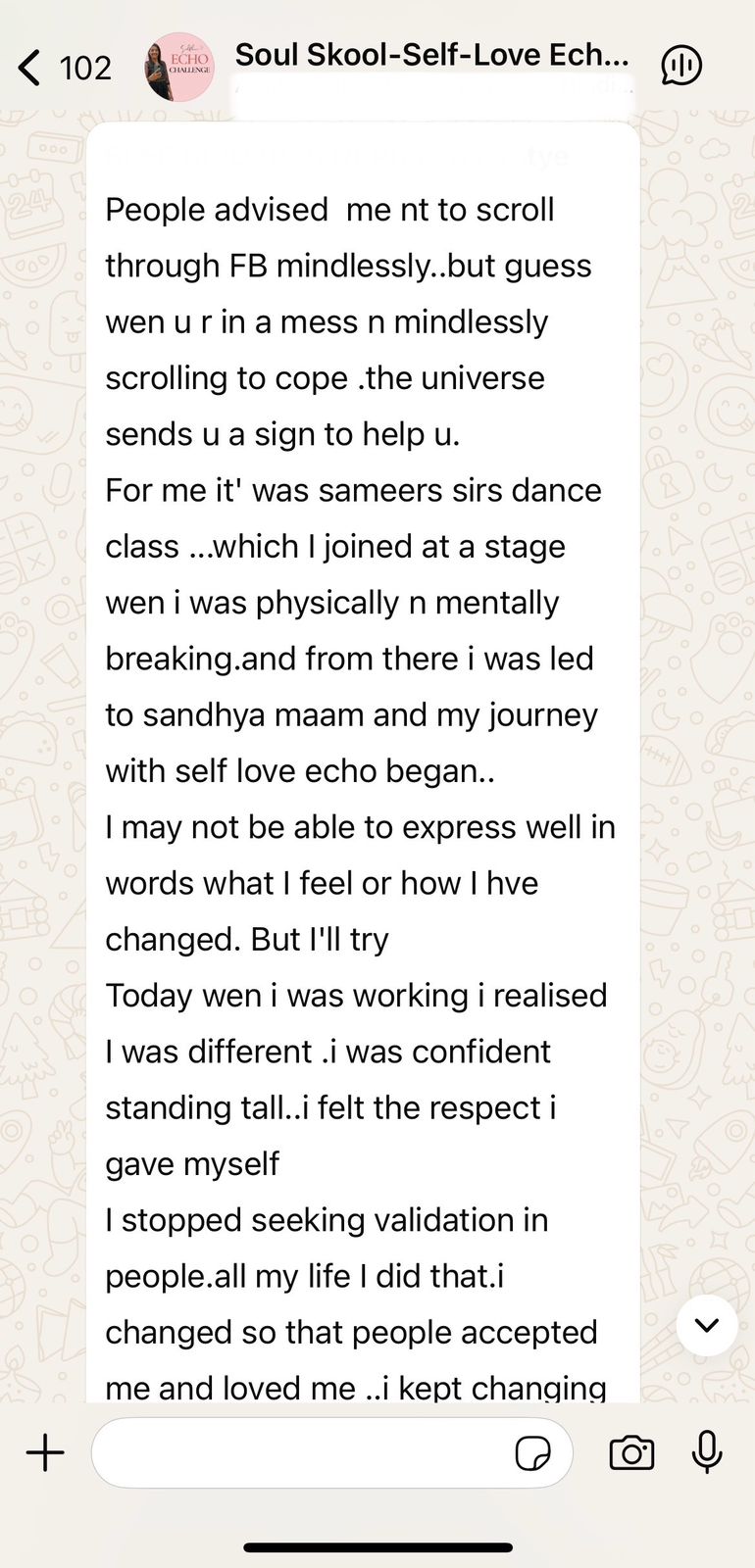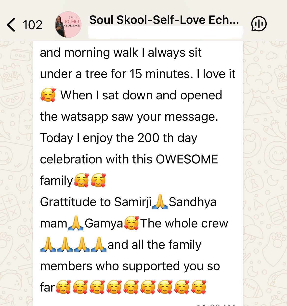 The Self-Love Echo Challenge taught me what self-love is, how to create boundaries, when to say 'no,' and how to let go of negative thoughts. - Bindhu