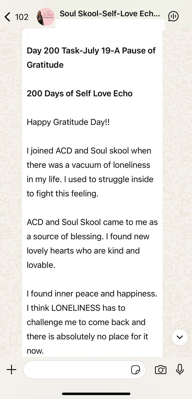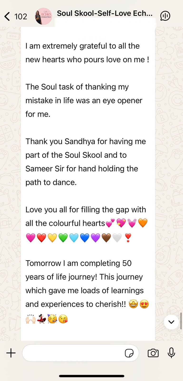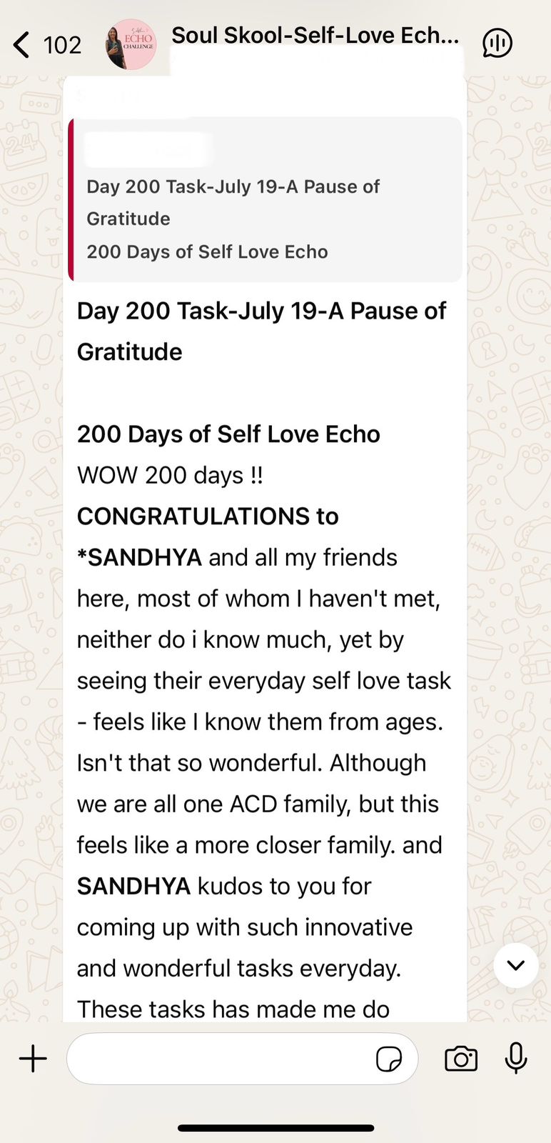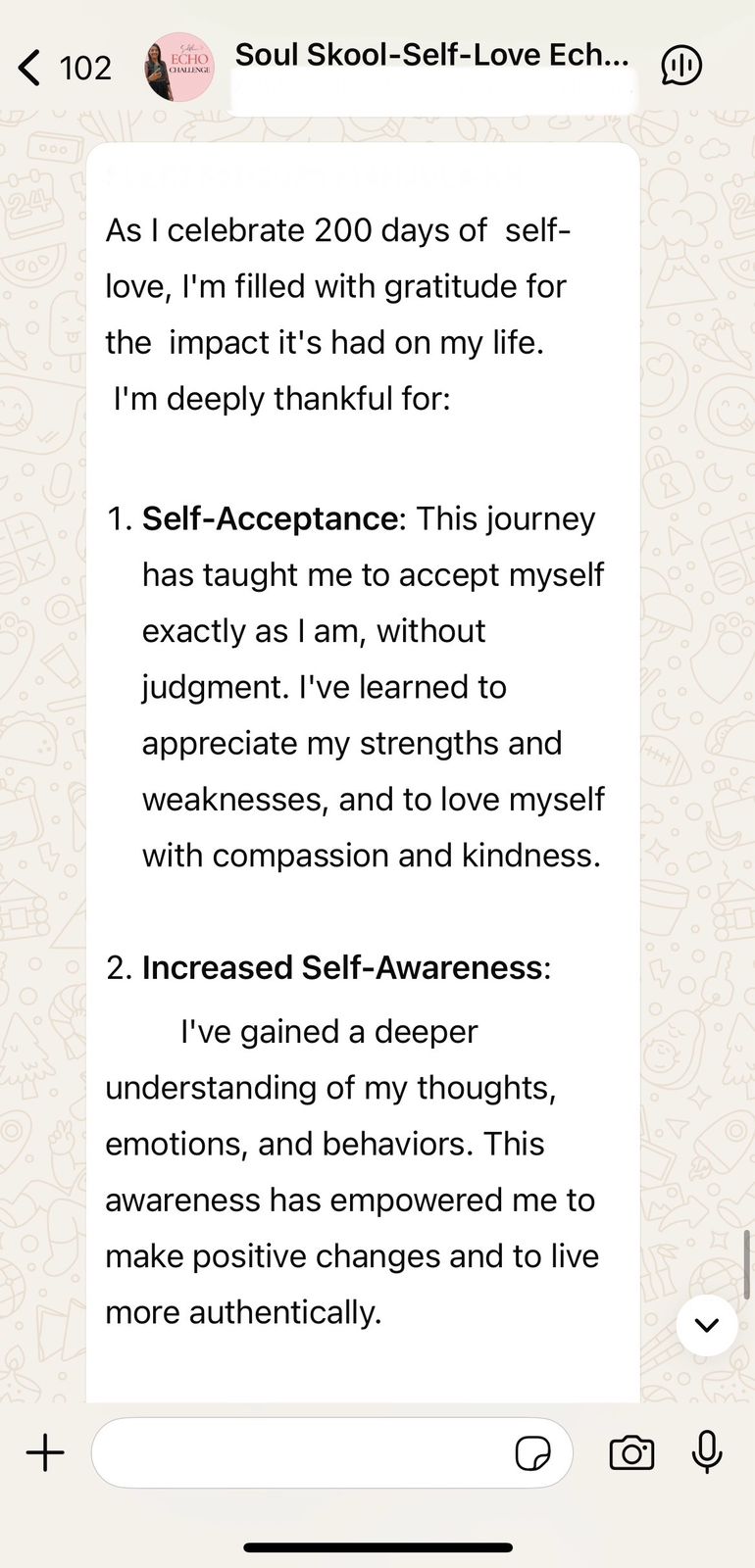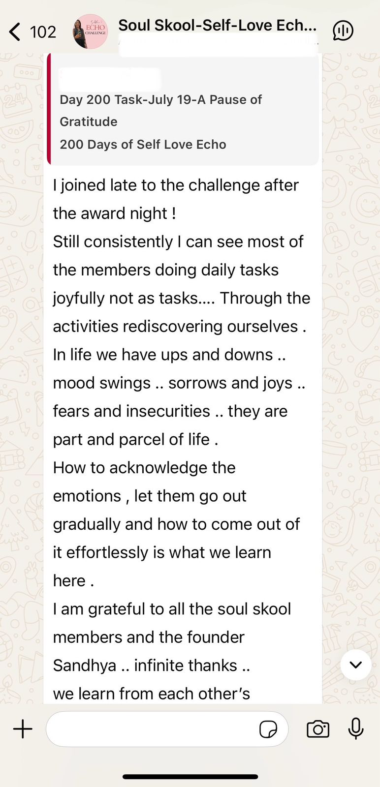 The Self-Love Echo Challenge taught me what self-love is, how to create boundaries, when to say 'no,' and how to let go of negative thoughts. - Bindhu