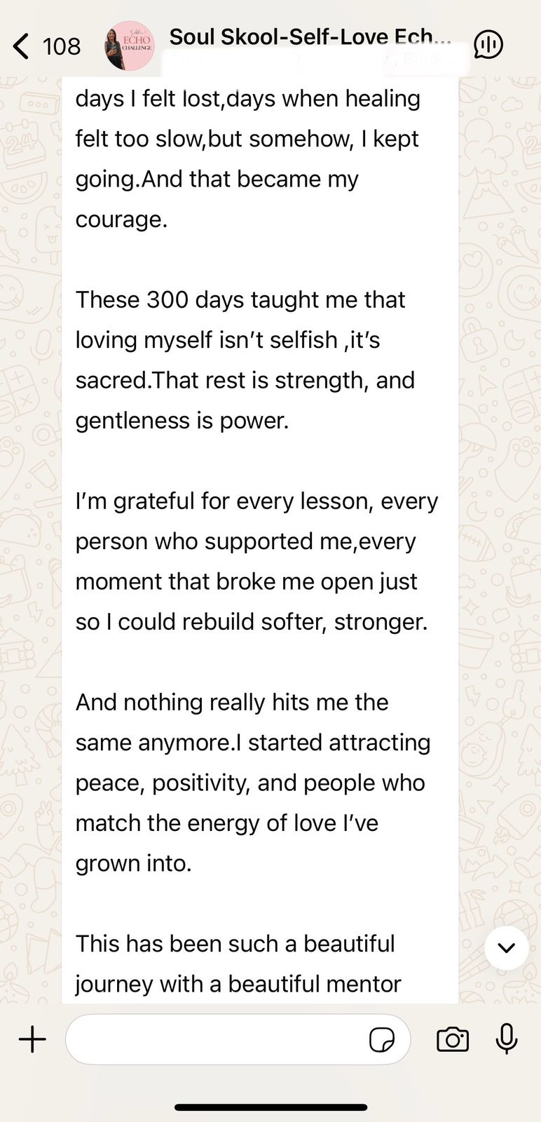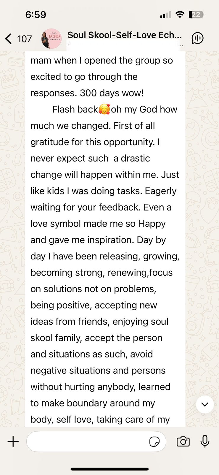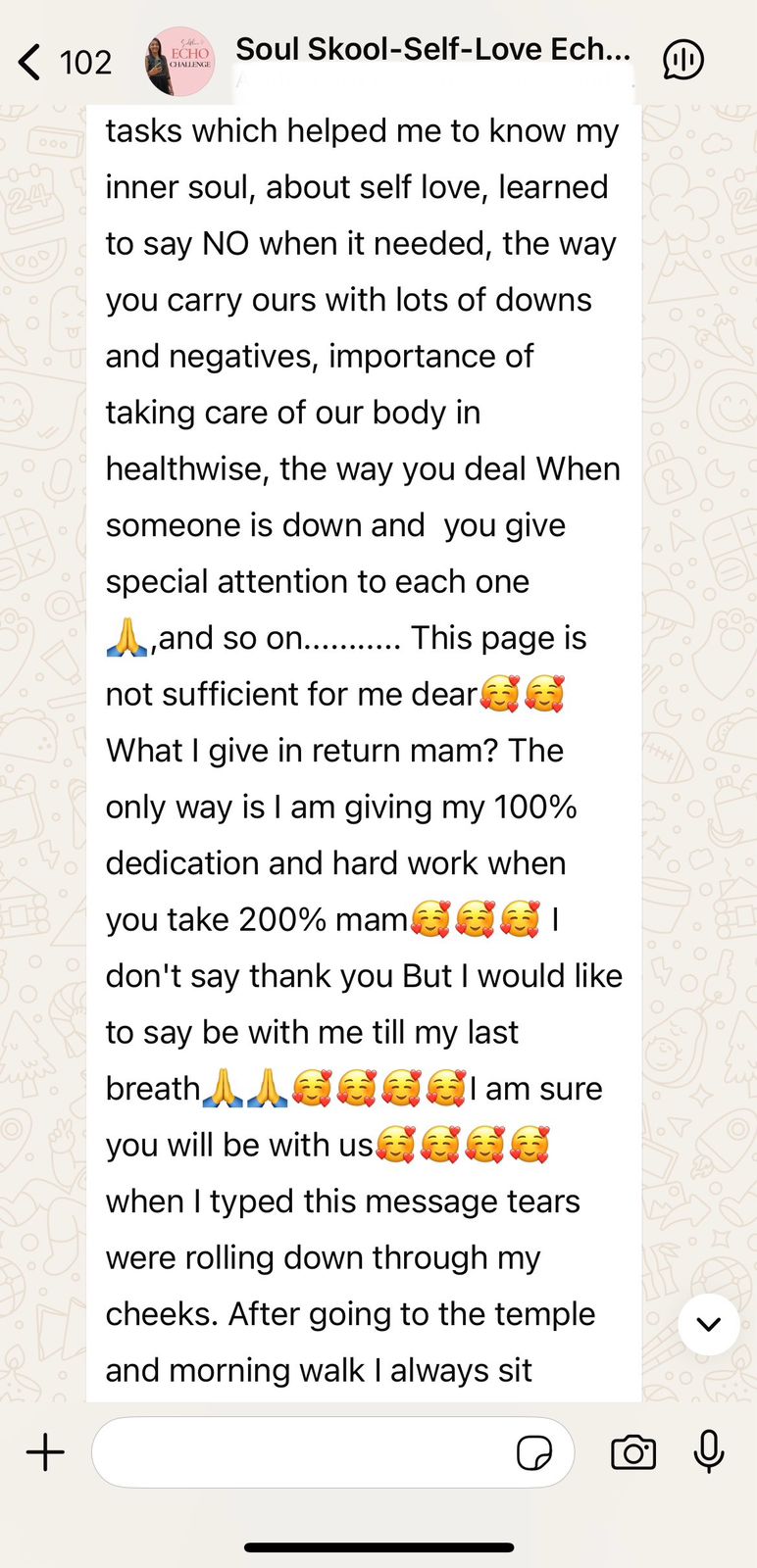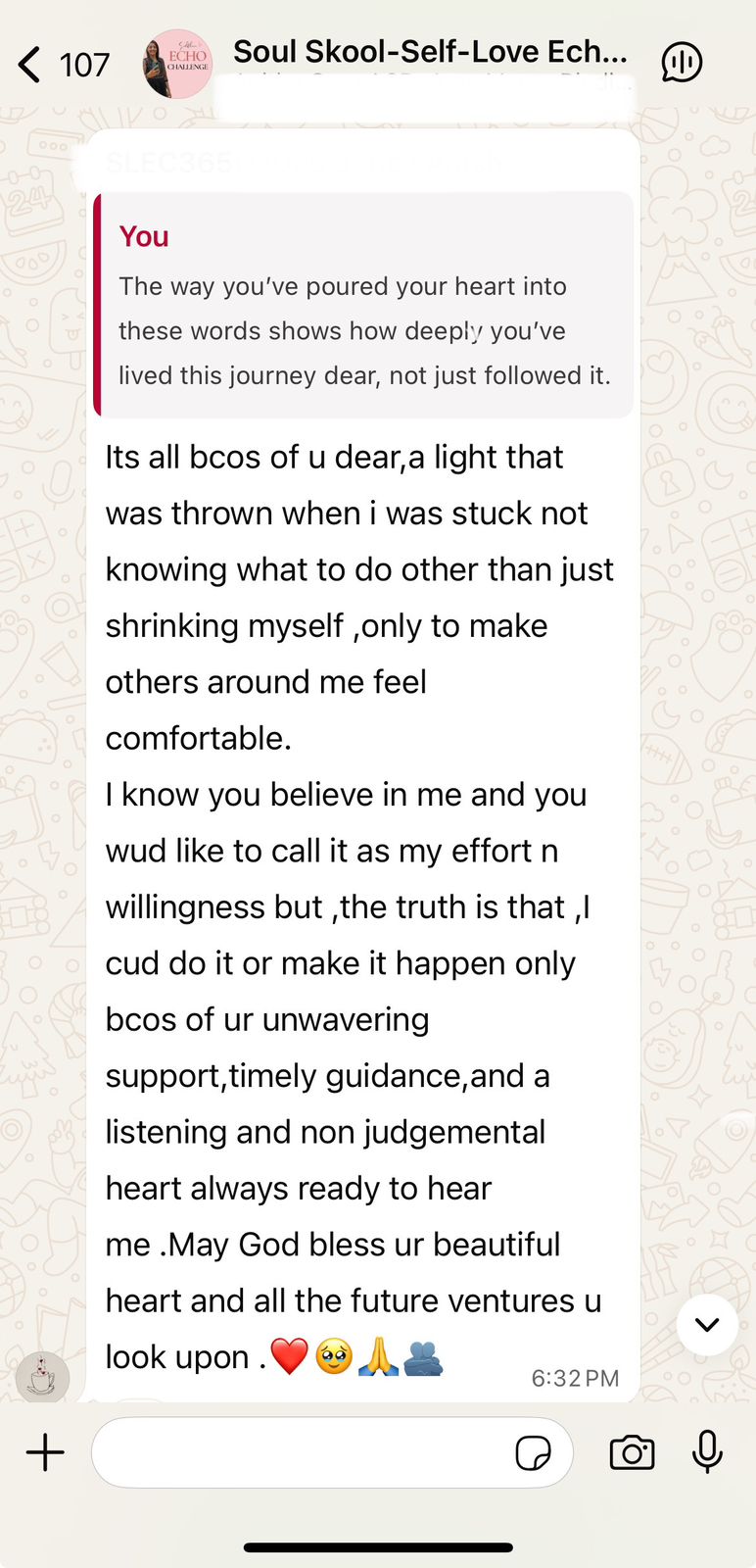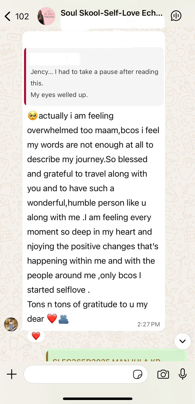 The Self-Love Echo Challenge helped me break through my limits, see my real self, and truly start loving myself. - Jency