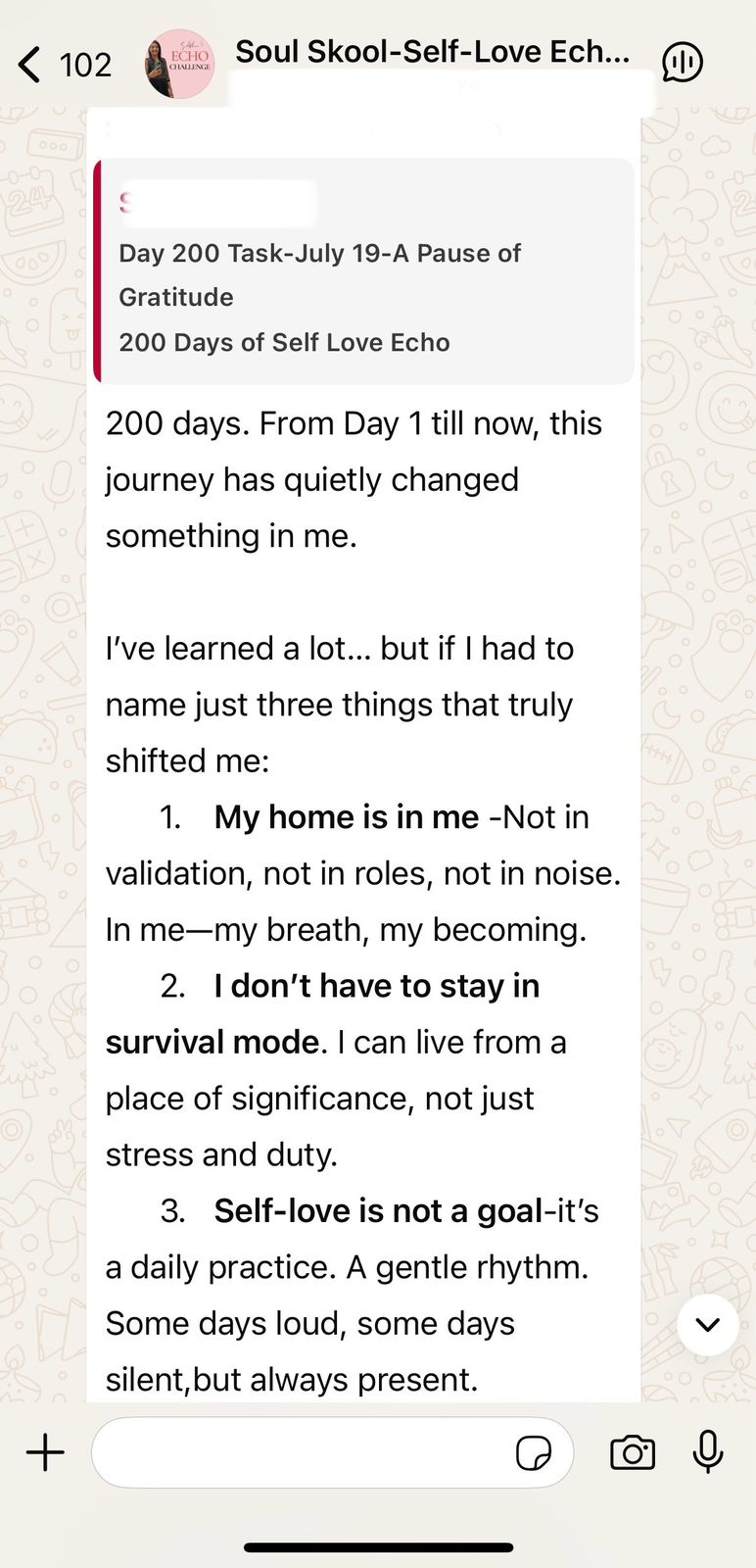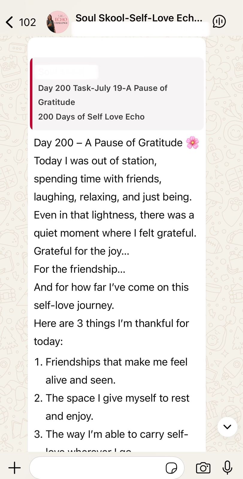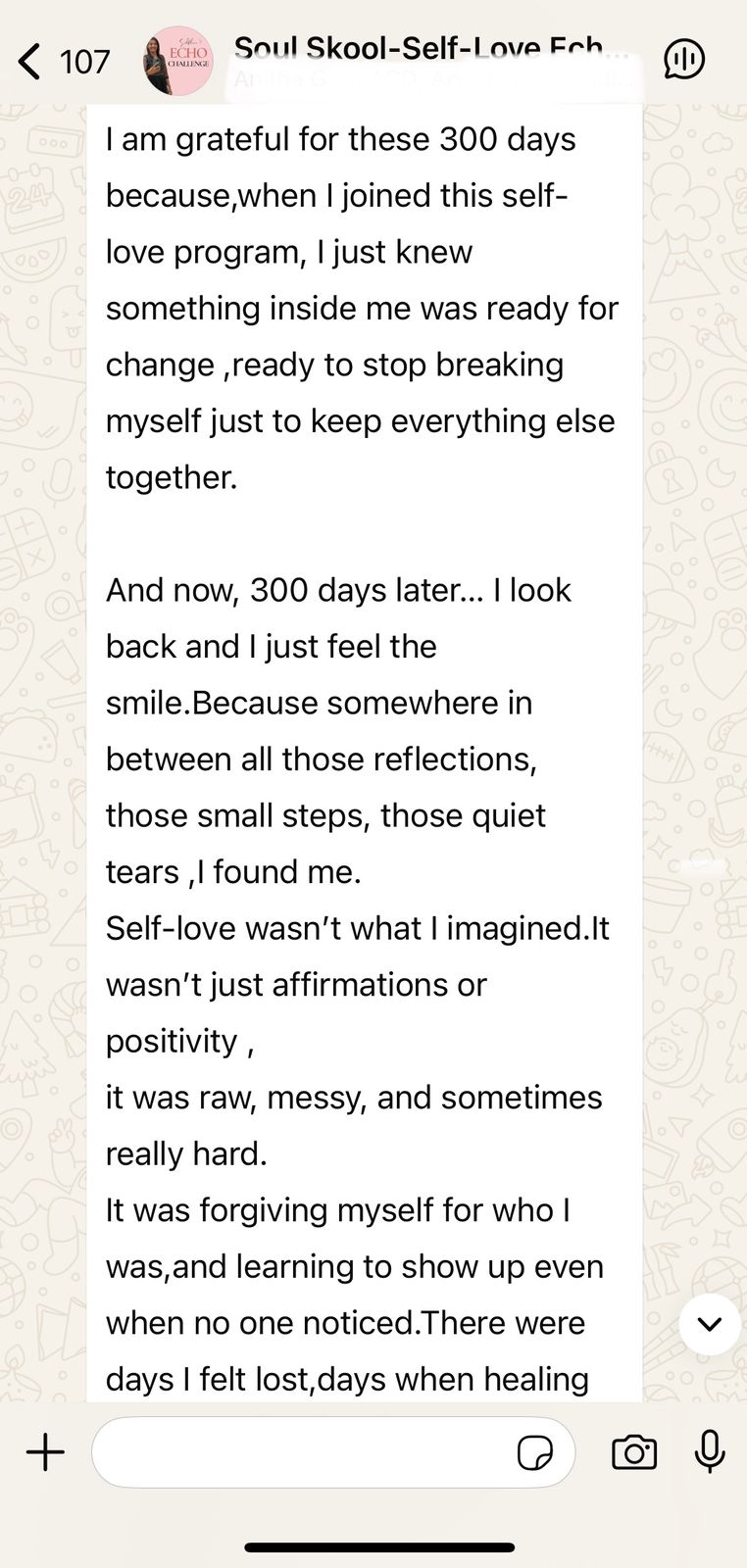 In January 2025, she launched Self Love Echo-365-Day WhatsApp Challenge, a daily practice of practical, reflective self-love where participants report visible gains in confidence, emotional clarity, and everyday joy.